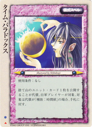 ![]() ![]() | タイム・パラドックス 儀式スペル 時間獣の封印 ▲ ブロック:六王国 使用条件:なし 捨て山のユニット・カード1枚を公開することが代償。自軍プレイヤーが対象。対象は代償が「種族:時間獣」の場合、手札に戻す。 illustrated by Shikidouji |