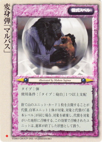 ![]() ![]() | 変身弾「マルバス」 儀式スペル 時間獣の封印 ◆ タイプ:弾 使用条件:「タイプ:砲台」1つ以上支配 捨て山のユニット・カード1枚を公開することが代償。自軍ユニット1体が対象。対象と代償の「基本レベル」が同じ場合、対象を破棄し、代償を対象がいた地形に召喚する。この効果で召喚されたユニットは、進軍が終了した状態として扱う。 illustrated by Makoto Sajima |