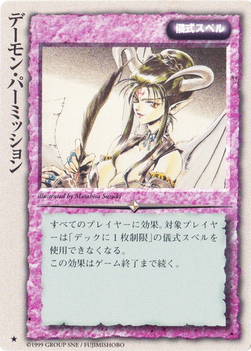 ![]() ![]() | デーモン・パーミッション 儀式スペル 黄金樹の守護者 ★ すべてのプレイヤーに効果。対象プレイヤーは「デックに1枚制限」の儀式スペルを使用できなくなる。 この効果はゲーム終了まで続く。 illustrated by Masahisa Suzuki |