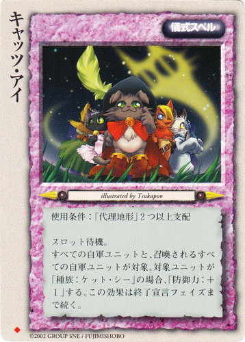 ![]() ![]() | キャッツ・アイ 儀式スペル 冥界の六皇子 ◆ 使用条件:「代理地形」2つ以上支配 スロット待機。 すべての自軍ユニットと、召喚されるすべての自軍ユニットが対象。対象ユニットが「種族:ケット・シー」の場合、「防御力:+1」する。この効果は終了宣言フェイズまで続く。 illustrated by Tsukapon |