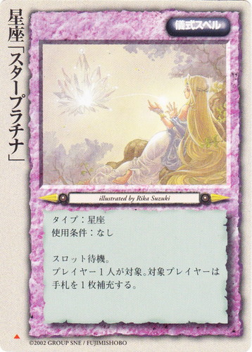 ![]() ![]() | 星座「スタープラチナ」 儀式スペル 冥界の六皇子 ▲ タイプ:星座 使用条件:なし スロット待機。 プレイヤー1人が対象。対象プレイヤーは手札を1枚補充する。 illustrated by Rika Suzuki |