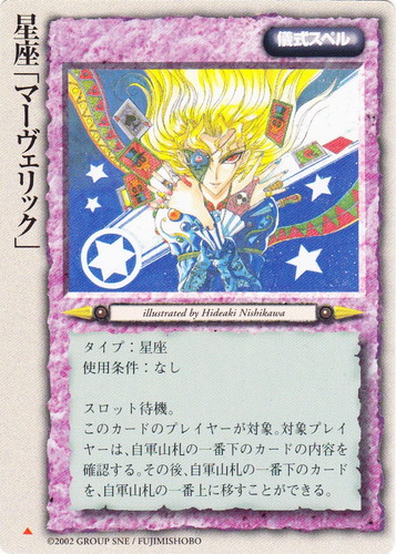 ![]() ![]() | 星座「マーヴェリック」 儀式スペル 冥界の六皇子 ▲ タイプ:星座 使用条件:なし スロット待機。 このカードのプレイヤーが対象。対象プレイヤーは、自軍山札の一番下のカードの内容を確認する。その後、自軍山札の一番下のカードを、自軍山札の一番上に移すことができる。 illustrated by Hideaki Nishikawa |