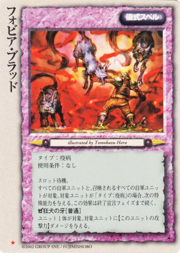 ![]() ![]() | フォビア・ブラッド 儀式スペル 冥界の六皇子 ★ タイプ:疫病 使用条件:なし スロット待機。 すべての自軍ユニットと、召喚されるすべての自軍ユニットが対象。対象ユニットが「タイプ:疫病」の場合、次の特殊能力を与える。この効果は終了宣言フェイズまで続く。 □狂犬の牙[普通] ユニット1体のが対象。対象ユニットに【このユニットの攻撃力】ダメージを与える。 illustrated by Tomokazu Hara |