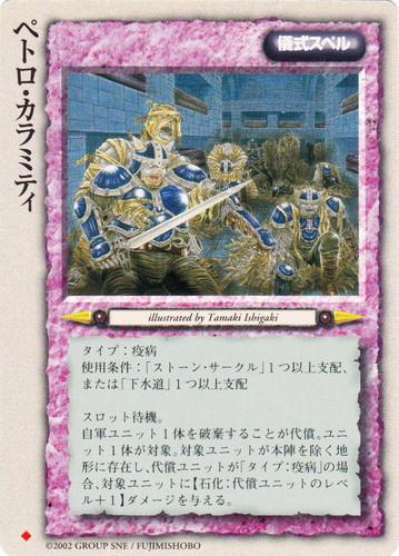 ![]() ![]() | ペトロ・カラミティ 儀式スペル 冥界の六皇子 ◆ タイプ:疫病 使用条件:「ストーン・サークル」1つ以上支配、または「下水道」1つ以上支配 スロット待機。 自軍ユニット1体を破棄することが代償。ユニット1体が対象。対象ユニットが本陣を除く地形に存在し、代償ユニットが「タイプ:疫病」の場合、対象ユニットに【石化:代償ユニットのレベル+1】ダメージを与える。 illustrated by Tamaki Ishigaki |