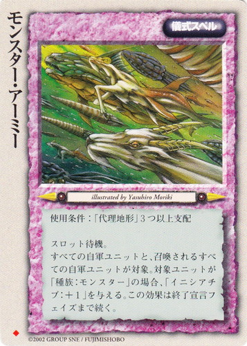![]() ![]() | モンスター・アーミー 儀式スペル 冥界の六皇子 ◆ 使用条件:「代理地形」3つ以上支配 スロット待機。 すべての自軍ユニットと、召喚されるすべての自軍ユニットが対象。対象ユニットが「種族:モンスター」の場合、「イニシアチブ:+1」を与える。この効果は終了宣言フェイズまで続く。 illustrated by Yasuhiro Moriki |