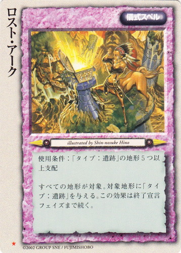 ![]() ![]() | ロスト・アーク 儀式スペル 冥界の六皇子 ★ 使用条件:「タイプ:遺跡」の地形5つ以上支配 すべての地形が対象。対象地形に「タイプ:遺跡」を与える。この効果は終了宣言フェイズまで続く。 illustrated by Shin-nosuke Hino |