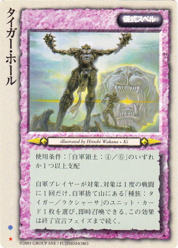 ![]() ![]() | タイガー・ホール 儀式スペル 竜皇の凱歌 ★ ブロック:六王国 使用条件:「自軍領土:④/⑥」のいずれか1つ以上支配 自軍プレイヤーが対象。対象は1度の戦闘に1回だけ、自軍捨て山にある「種族:タイガー/ラクシャーサ」のユニット・カード1枚を選び、即時召喚できる。この効果は終了宣言フェイズまで続く。 illustrated by Hitoshi Wakana+Ki |