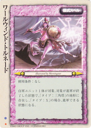 ![]() ![]() | ワールウィンド・トルネード 儀式スペル 竜皇の凱歌 ★ ブロック:六王国 使用条件:なし 自軍ユニット1体が対象。対象が進軍が終了した状態で、「タイプ:三角塔」の地形に存在し、「タイプ:X」の場合、進軍できる状態になる。 illustrated by Morningstar |