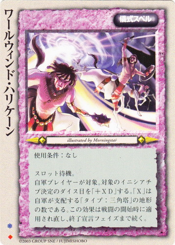![]() ![]() | ツイスター 儀式スペル 魔道士の黙示録 ◆ デックに1枚制限。「本陣」以外に存在するユニットすべてに効果。対象ユニットが「進軍タイプ:飛行/長距離飛行」の場合、【竜巻:2Dして一番高い目】ダメージを与える。 illustrated by Kenji Tsuruta |