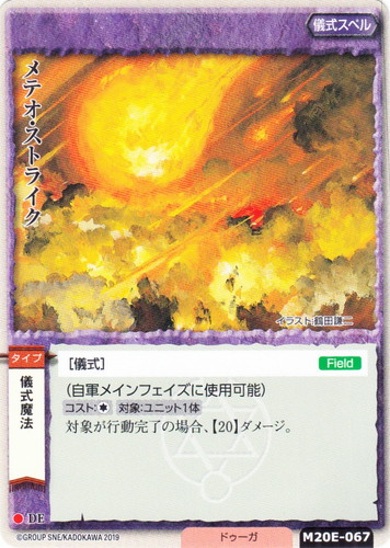 ![]() ![]() | M20E-067 メテオ・ストライク 儀式スペル モンスター・コレクションDeus ● 種族:儀式魔法 ブロック:DE 勢力:ドゥーガ [儀式]【Field】 (自軍メインフェイズに使用可能) コスト:(*) 対象:ユニット1体 対象が行動完了の場合、【20】ダメージ。 illustrated by 鶴田謙二 |