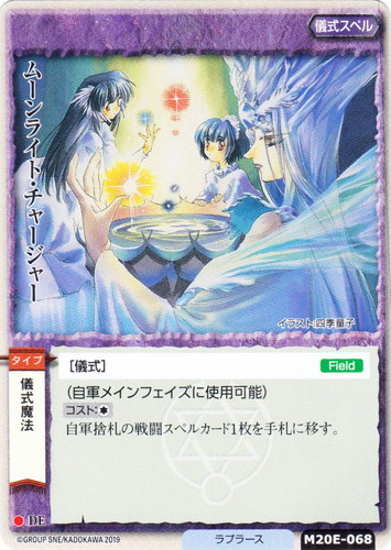 ![]() ![]() | M20E-068 ムーンライト・チャージャー 儀式スペル モンスター・コレクションDeus ● 種族:儀式魔法 ブロック:DE 勢力:ラプラース [儀式]【Field】 (自軍メインフェイズに使用可能) コスト:(*) 自軍捨札の戦闘スペルカード1枚を手札に移す。 illustrated by 四季童子 |