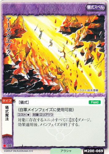 ![]() ![]() | M20E-069 アースクエイク 儀式スペル モンスター・コレクションDeus ● 種族:儀式魔法 ブロック:DE 勢力:アラシャ [儀式]【Field】 (自軍メインフェイズに使用可能) コスト:(*) 対象:エリア1つ 対象に存在するユニットすべてに【2D】ダメージ。効果適用後、メインフェイズが終了する。 illustrated by 鈴木理華 |