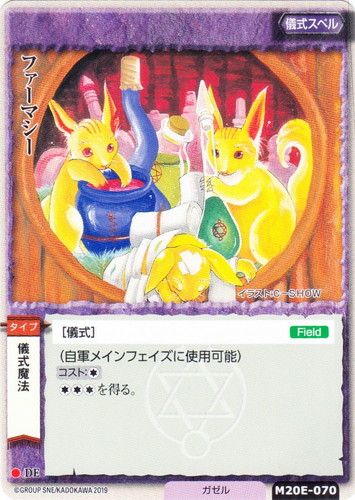 ![]() ![]() | M20E-070 ファーマシー 儀式スペル モンスター・コレクションDeus ● 種族:儀式魔法 ブロック:DE 勢力:ガゼル [儀式]【Field】 (自軍メインフェイズに使用可能) コスト:(*) (*)(*)(*)を得る。 illustrated by C-SHOW |