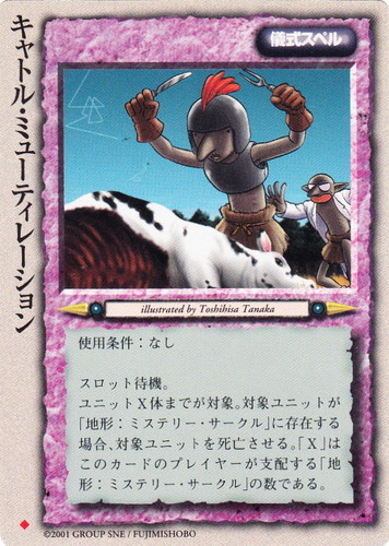 ![]() ![]() | キャトル・ミューティレーション 儀式スペル 魔法帝国の興亡 ◆ 使用条件:なし スロット待機。 ユニットX体までが対象。対象ユニットが「地形:ミステリー・サークル」に存在する場合、対象ユニットを死亡させる。「X」はこのカードのプレイヤーが支配する「地形:ミステリー・サークル」の数である。 illustrated by Toshihisa Tanaka |