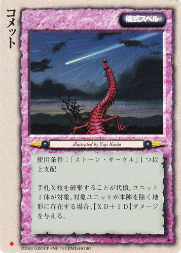 ![]() ![]() | コメット 儀式スペル ビギナーズ・セット(ファイア・ドラゴン) ◆ 使用条件:「ストーン・サークル」1つ以上支配。 「手札:X枚」を破棄することが代償。ユニット1体が対象。対象ユニットが本陣以外に存在する場合、【XD+1D】ダメージを与える。 illustrated by Yuuko Tsukishiro |