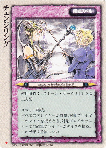 ![]() ![]() | チェンジリング 儀式スペル 魔法帝国の興亡 ★ 使用条件:「ストーン・サークル」1つ以上支配 スロット継続 すべてのプレイヤーが対象。対象プレイヤーがダイスを振るとき、対象プレイヤーにとっての敵軍プレイヤーがダイスを振る。この効果は重複しない。 illustrated by Masahisa Suzuki |