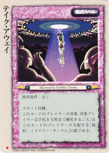 ![]() ![]() | テイク・アウェイ 儀式スペル 魔法帝国の興亡 ◆ 使用条件:なし スロット待機。 このカードのプレイヤーが対象。対象プレイヤーは手札をX枚まで補充する。「X」はこのカードのプレイヤーが支配する「地形:ミステリー・サークル」の数である。 illustrated by Toshihisa Tanaka |