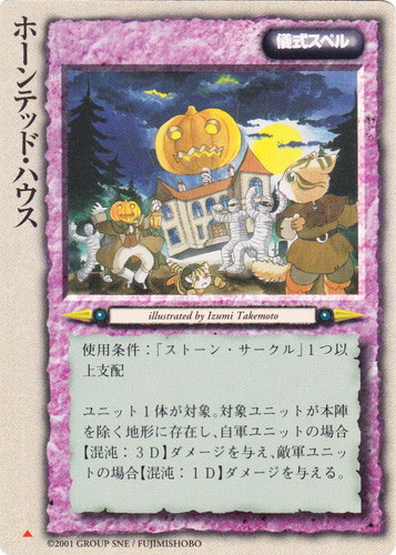 ![]() ![]() | ホーンテッド・ハウス 儀式スペル 魔法帝国の興亡 ▲ 使用条件:「ストーン・サークル」1つ以上支配 ユニット1体が対象。対象ユニットが本陣を除く地形に存在し、自軍ユニットの場合【混沌:3D】ダメージを与え、敵軍ユニットの場合【混沌:1D】ダメージを与える。 illustrated by Izumi Takemoto |
