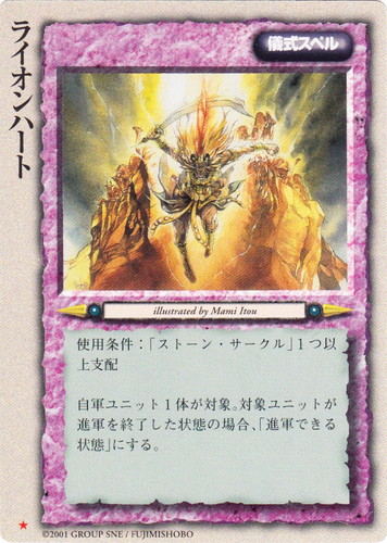 ![]() ![]() | ライオンハート 儀式スペル 魔法帝国の興亡 ★ 使用条件:「ストーン・サークル」1つ以上支配 自軍ユニット1体が対象。対象ユニットが進軍を終了した状態の場合、「進軍できる状態」にする。 illustrated by Mami Itou |
