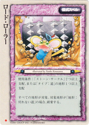 ![]() ![]() | ロード・ローラー 儀式スペル 魔法帝国の興亡 ◆ 使用条件:「ストーン・サークル」2つ以上支配、または「タイプ:道」の地形1つ以上支配 すべての地形が対象。対象地形が「地形:戻れない道」の場合、破棄する。 illustrated by Naoko Kanazawa |