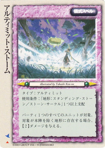 ![]() ![]() | アルティミット・ストーム 儀式スペル 新聖紀の胎動 ▲ ブロック:聖エルド伝 タイプ:アルティミット 使用条件:「地形:スタンディング・ストーン/ストーン・サークル」1つ以上支配 パーティ1つのすべてのユニットが対象。対象が本陣を除く地形に存在する場合、【2】ダメージを与える。 illustrated by Takashi Kon-no |