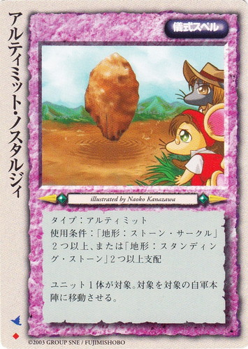 ![]() ![]() | アルティミット・ノスタルジィ 儀式スペル 新聖紀の胎動 ◆ ブロック:聖エルド伝 タイプ:アルティミット 使用条件:「地形:ストーン・サークル」2つ以上、または「地形:スタンディング・ストーン」2つ以上支配 ユニット1体が対象。対象を対象の自軍本陣に移動する。 illustrated by Naoko Kanazawa |