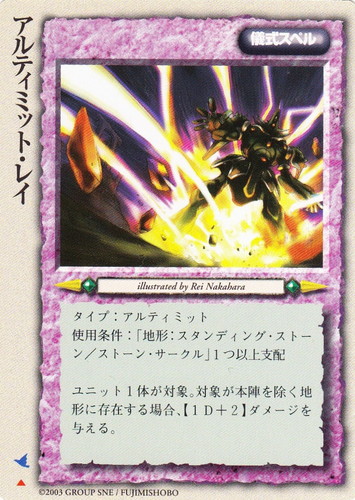 ![]() ![]() | アルティミット・レイ 儀式スペル 新聖紀の胎動 ▲ ブロック:聖エルド伝 タイプ:アルティミット 使用条件:「地形:スタンディング・ストーン/ストーン・サークル」1つ以上支配 ユニット1体が対象。対象が本陣を除く地形に存在する場合、【1D+2】ダメージを与える。 illustrated by Rei Nakahara |
