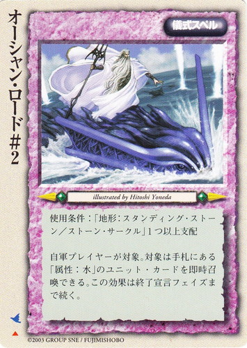 ![]() ![]() | オーシャン・ロード 儀式スペル 魔道士の黙示録 ★ デックに1枚制限。このカードを使用するには、2つ以上の「地形:ストーン・サークル」を支配していなければならない。 自分の手札にある「属性:水」のユニット・カードを、戦場に存在する対戦相手本陣以外の「誰もいない地形」と「自軍の支配地形」に「普通召喚」できるようになる。この効果はゲーム終了まで続く。このカードは破棄せず示し続けること。 illustrated by Hitoshi Yoneda |