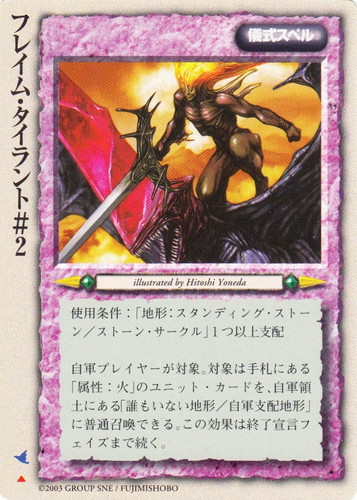 ![]() ![]() | フレイム・タイラント#2 儀式スペル 新聖紀の胎動 ▲ ブロック:聖エルド伝 使用条件:「地形:スタンディング・ストーン/ストーン・サークル」1つ以上支配 自軍プレイヤーが対象。対象は手札にある「属性:火」のユニット・カードを即時召喚できる。この効果は終了宣言フェイズまで続く。 illustrated by Hitoshi Yoneda |