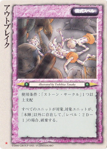 ![]() ![]() | アウトブレイク 儀式スペル 太陽王の覚醒 ★ 使用条件:「ストーン・サークル」1つ以上支配 すべてのユニットが対象。対象ユニットが、「本陣」以外に存在して、「レベル:2D-1」の場合、破棄する。 illustrated by Toshihisa Tanaka |