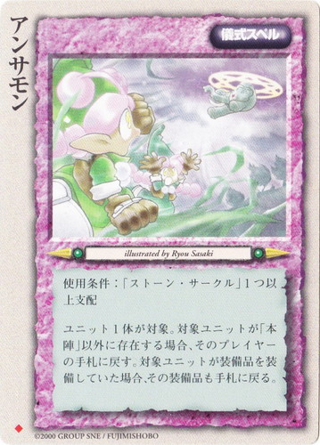 ![]() ![]() | アンサモン 儀式スペル 太陽王の覚醒 ◆ 使用条件:「ストーン・サークル」1つ以上支配 ユニット1体が対象。対象ユニットが「本陣」以外に存在する場合、そのプレイヤーの手札に戻す。対象ユニットが装備品を装備していた場合、その装備品も手札に戻る。 illustrated by Ryou Sasaki |