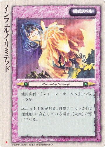 ![]() ![]() | インフェルノ 儀式スペル モンスター・コレクション ★ デックに1枚制限。「地形:代理地形」の上に存在するすべてのユニットを、【火炎】によって死亡させる。 illustrated by Gouta Nanami |