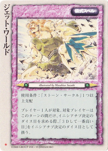 ![]() ![]() | ジェット・ワールド 儀式スペル 太陽王の覚醒 ★ 使用条件:「ストーン・サークル」1つ以上支配 プレイヤー1人が対象。対象プレイヤーはこのターンの間だけ、イニシアチブ決定のダイス目を求める際、「3Dして一番高い目」をイニシアチブ決定のダイス目として扱う。 illustrated by Masahisa Suzuki |