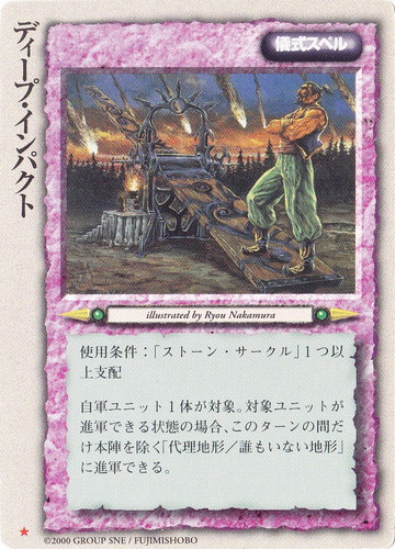 ![]() ![]() | ディープ・インパクト 儀式スペル 太陽王の覚醒 ★ 使用条件:「ストーン・サークル」1つ以上支配 自軍ユニット1体が対象。対象ユニットが進軍できる状態の場合、このターンの間だけ本陣を除く「代理地形/誰もいない地形」に進軍できる。 illustrated by Ryou Nakamura |