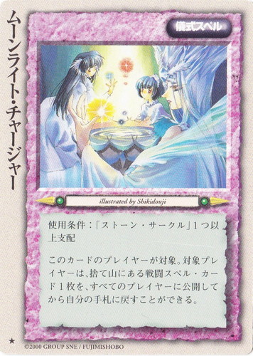 ![]() ![]() | ムーンライト・チャージャー 儀式スペル 太陽王の覚醒 ★ 使用条件:「ストーン・サークル」1つ以上支配 このカードのプレイヤーが対象。対象プレイヤーは、捨て山にある戦闘スペル・カード1枚を、すべてのプレイヤーに公開してから自分の手札に戻すことができる。 illustrated by Shikidouji |