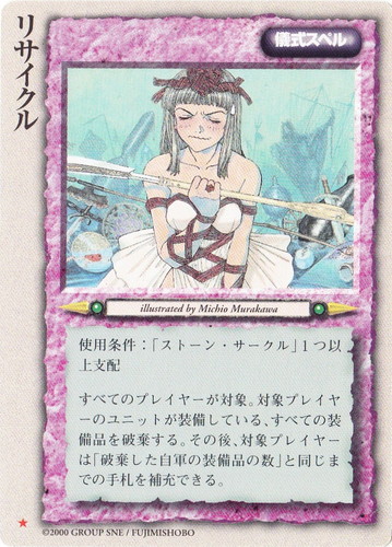 ![]() ![]() | リサイクル 儀式スペル 太陽王の覚醒 ★ 使用条件:「ストーン・サークル」1つ以上支配 すべてのプレイヤーが対象。対象プレイヤーのユニットが存在している、すべての装備品を破棄する。その後、対象プレイヤーは「破棄した自軍の装備品の数」と同じまでの手札を補充できる。 illustrated by Michio Murakawa |
