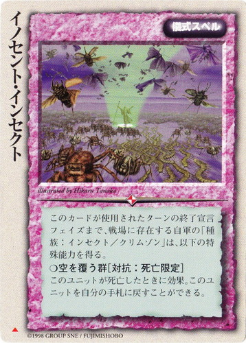 ![]() ![]() | イノセント・インセクト 儀式スペル 灼熱の百年戦争 ▲ 使用条件:「ストーン・サークル」1つ以上支配 このカードのプレイヤーが対象。対象プレイヤーの自軍ユニットが「種族:インセクト/クリムゾン/スコーピオン/ターマイト」で、戦闘中に死亡した場合、手札に戻さなければならない。同時攻撃タイミングにはこの効果は発揮されない。この効果はこのカードが使用されたターンの終了宣言まで続く。 illustrated by Yuji Kaida |