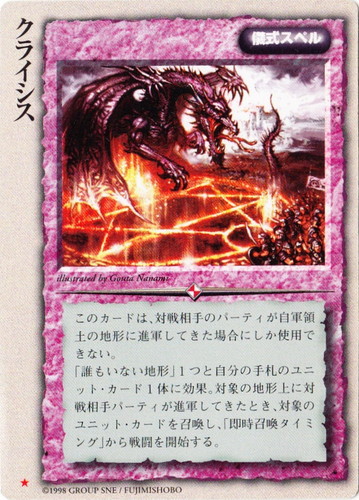 ![]() ![]() | クライシス 儀式スペル 魔道士の黙示録 ★ このカードは、対戦相手のパーティが自軍領土の地形に進軍してきた場合にしか使用できない。 「誰もいない地形」1つと自分の手札のユニット・カード1体に効果。対象の地形上に対戦相手パーティが進軍してきたとき、対象のユニット・カードを召喚し、「即時召喚タイミング」から戦闘を開始する。 illustrated by Gouta Nanami |