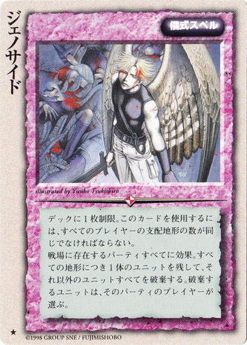 ![]() ![]() | ジェノサイド 儀式スペル 魔道士の黙示録 ★ デックに1枚制限。このカードを使用するには、すべてのプレイヤーの支配地形が同じでなければならない。 戦場に存在するパーティすべてに効果。すべての地形につき1体のユニットを残して、それ以外のユニットすべてを破棄する。破棄するユニットは、そのパーティのプレイヤーが選ぶ。 illustrated by Yuuko Tsukishiro |