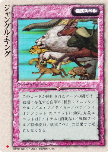 ![]() ![]() | ジャングル・キング 儀式スペル 魔道士の黙示録 ◆ このカードが使用されたターンの間だけ、戦場に存在する「種族:アニマル/ウルフ/エイプ/タイガー/ベア/ライオン/ラット」のユニットに効果。対象ユニットは「アイテム(消耗品)/戦闘スペル/特殊能力/儀式スペル」の効果では死亡しなくなる。。 illustrated by Yuuji Kaida |