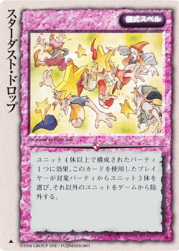 ![]() ![]() | スターダスト・ドロップ 儀式スペル 魔道士の黙示録 ▲ ユニット4体以上で構成されたパーティ1つに効果。このカードを使用したプレイヤーが対象パーティからユニット3体を選び、それ以外のユニットをゲームから除外する。 illustrated by Peter Salt |