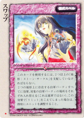 ![]() ![]() | スワップ 儀式スペル 魔道士の黙示録 ★ このカードを使用するには、2つ以上の「地形:ストーン・サークル」を支配していなければならない。 2つの地形上に存在する自軍パーティすべてに効果。対象の自軍パーティの場所をそれぞれ入れ替える(これは進軍ではない)。この効果で「リミット」をこえてしまった場合は、即座にユニットを調整すること。 illustrated by Shikidouji |