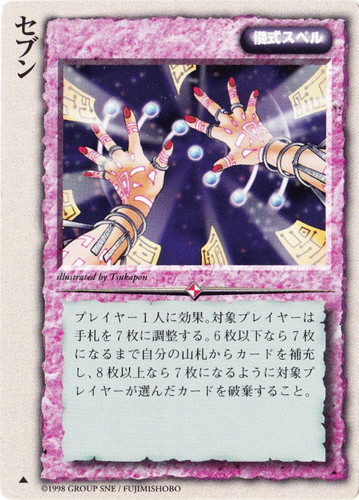 ![]() ![]() | セブン 儀式スペル 魔道士の黙示録 ▲ プレイヤー1人に効果。対象プレイヤーは手札を7枚に調整する。6枚以下なら7枚になるまえ自分の山札からカードを補充し、8枚以上なら7枚になるように対象プレイヤーが選んだカードを破棄すること。 illustrated by Tsukapon |