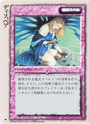 ![]() ![]() | ディスペア 儀式スペル 魔道士の黙示録 ▲ 使用される儀式スペル1つの効果を打ち消す。さらに、この効果で儀式スペルの効果を打ち消されたプレイヤーは、手札をランダムに1枚破棄しなければならない。 illustrated by Kunio Aoki |
