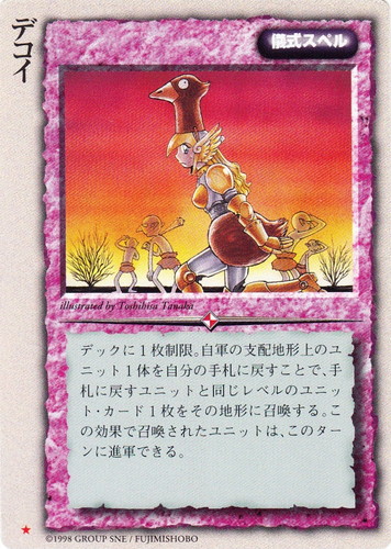 ![]() ![]() | デコイ 儀式スペル 魔道士の黙示録 ★ デックに1枚制限。自軍の支配地形上のユニット1体を自分の手札に戻すことで、手札に戻すユニットと同じレベルのユニット・カード1枚をその地形に召喚する。この効果で召喚されたユニットは、このターンに進軍できる。 illustrated by Toshihisa Tanaka |