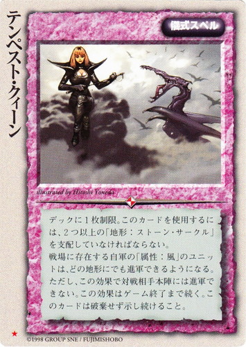 ![]() ![]() | テンペスト・クィーン 儀式スペル 魔道士の黙示録 ★ デックに1枚制限。このカードを使用するには、2つ以上の「地形:ストーン・サークル」を支配していなければならない。 戦場に存在する「属性:風」のユニットは、どの地形にでも進軍できるようになる。ただし、この効果で対戦相手本陣には進軍できない。この効果はゲーム終了まで続く。このカードは破棄せず示し続けること。 illustrated by Hitoshi Yoneda |