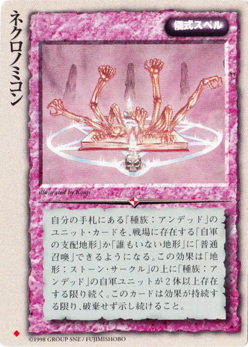 ![]() ![]() | ネクロノミコン 儀式スペル 魔道士の黙示録 ◆ 自分の手札にある「種族:アンデッド」のユニット・カードを、戦場に存在する「自軍の支配地形」か「誰もいない地形」に「普通召喚」できるようになる。この効果は「地形:ストーン・サークル」の上に「種族:アンデッド」の自軍ユニットが2体以上存在する限りつづく。このカードは効果が持続する限り、破棄せず示し続けること。 illustrated by Kouji |