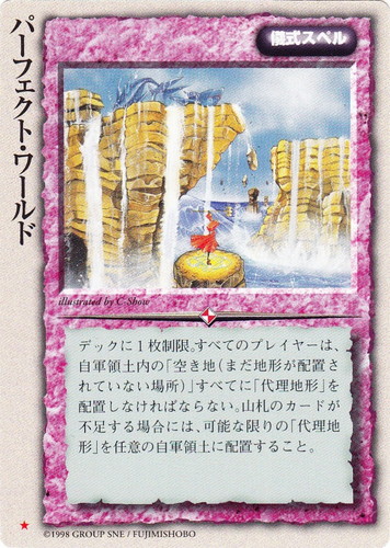 ![]() ![]() | パーフェクト・ワールド 儀式スペル 魔道士の黙示録 ★ デックに1枚制限。すべてのプレイヤーは、自軍領土内の「空き地(まだ地形が配置されていない場所)」すべてに「代理地形」を配置しなければならない。山札のカードが不足する場合には、可能な限りの「代理地形」を任意の領土内に配置すること。 illustrated by C-Show |