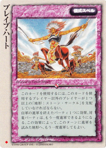![]() ![]() | ブレイブ・ハート 儀式スペル 魔道士の黙示録 ◆ このカードを使用するには、このカードを使用するプレイヤー以外のプレイヤーが1つ以上の「地形:ストーン・サークル」を支配していなければならない。 自軍の進軍を終えたパーティ1つに効果。対象パーティは、もう一度進軍できるようになる。この効果によって、このターンに進軍を試みた地形へ、もう一度進軍してもよい。 illustrated by Tamaki Ishigaki |