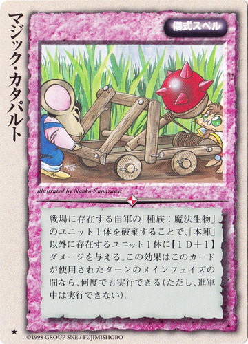 ![]() ![]() | マジック・カタパルト 儀式スペル 魔道士の黙示録 ★ 戦場に存在する自軍の「種族:魔法生物」のユニット1体を破棄することで、「本陣」以外に存在するユニット1体に【1D+1】ダメージを与える。この効果はこのカードが使用されたターンのメインフェイズの間なら、何度でも実行できる(ただし、進軍中は実行できない)。 illustrated by Naoko Kanazawa |